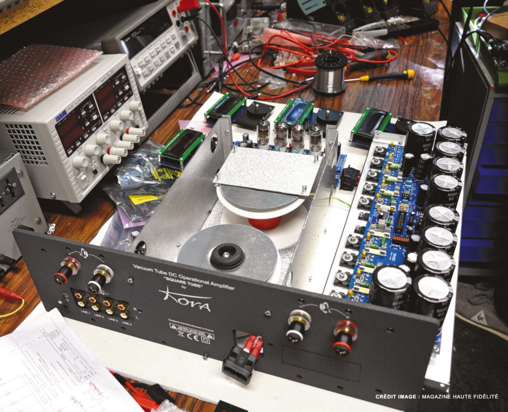 Le concepteur du fameux circuit Square Tube peut exprimer sa passion avec Kora, en plus de celle de la musique. Il pose ici devant ses vitrines, extraordinaire collection de tubes anciens de haute valeur, réunissant des raretés comme le premier tube français TM (Triode militaire) de M. Ferrié, datant de 1915. S’y ajoute une collection unique de haut-parleurs d’époque, casques et radios anciennes : le maître des lieux est intarissable sur l’histoire du son. Kora conçoit ses amplificateurs TB mais aussi les amplis de guitare Dewitte-Wired, et officie pour sept clients hi-fi.